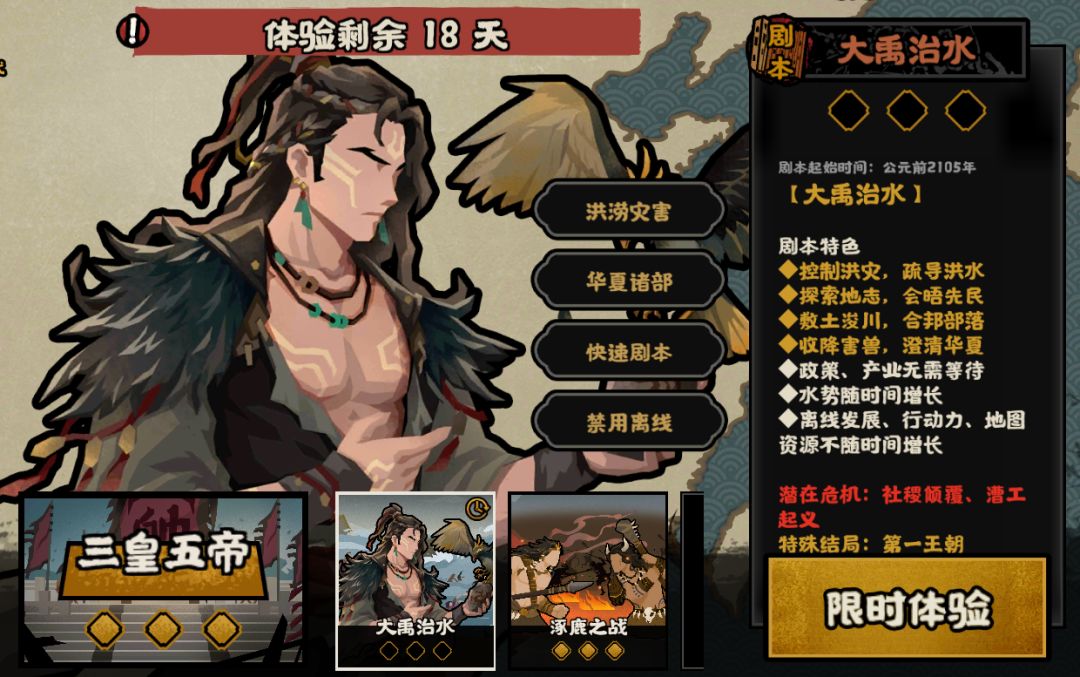 《大禹治水》和《横扫六合》一样,是一个禁用离线的快速剧本。缺点是不论在线还是离线,资源都不会随时间增长,行动力也不会随时间恢复。优点是施行政策、升级建筑都不需要时间。但是循环政策有次数限制,需要消灭其他势力来刷新次数。最后一些名臣的政策也会有变动,这个到后面推荐阵容的时候再讲。