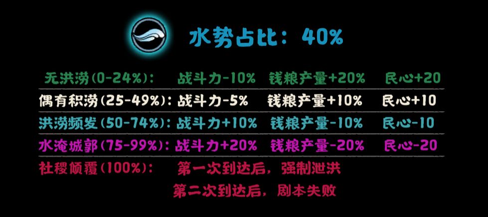 《大禹治水》的剧本特色一个是“洪涝灾害”,在剧本中通过水势来体现。施行民生和部分政治政策,升级获得特殊资源的建筑,进攻其他城市都会增加水势。占领城市可以提升水势的上限,施行部分名臣和时代政策能够减少水势。水势的高低会影响战斗力、钱粮产量、民心。水势达到上限之后,第一次会强制泄洪水势归零,但是无法获得高级结局,第二次就直接失败了。