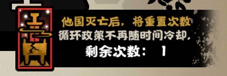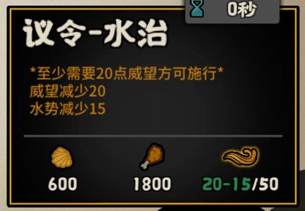 需要注意的是在政治政策中有三个消耗威望的政策可以分别降低水势、增加发展时间、重置子弟兵增加战斗力,正好对应上面提到的水势、资源、作战能力。所以威望也很有用,可以再关键时刻解燃眉之急。