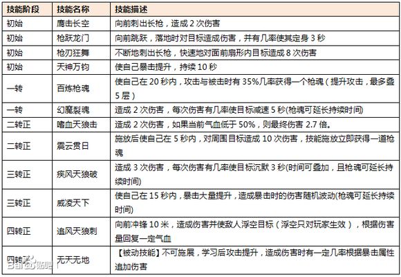 追风天狼刺:向前冲锋10米,还可以使敌人浮空,并且伤害的10%会转为治疗。适合在对战中快速接近对手,浮空的时候对方受到伤害有几率延长浮空,对于正枪来说,一次浮空就有可能解决对方了。