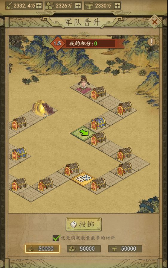 玩法说明:消耗三种基础物资投掷骰子,根据投掷的骰子点数行军前进,并拾取路途中的积分箱子。到达每层的终点后成功晋升,获得晋升奖励。晋升的层数越高,消耗的资源越多能获得的积分越高。