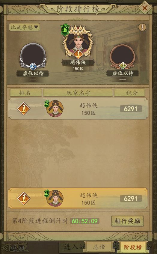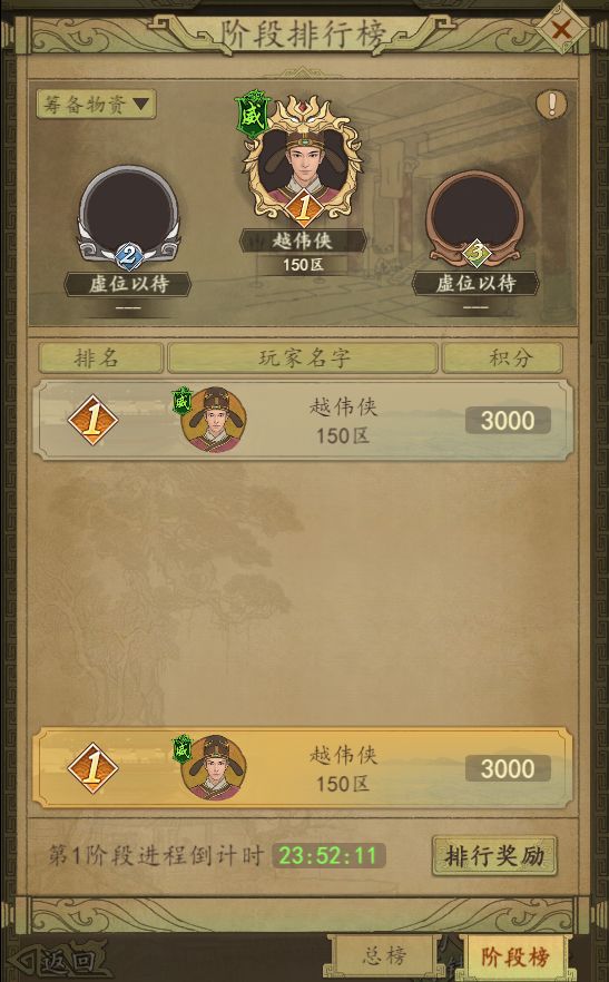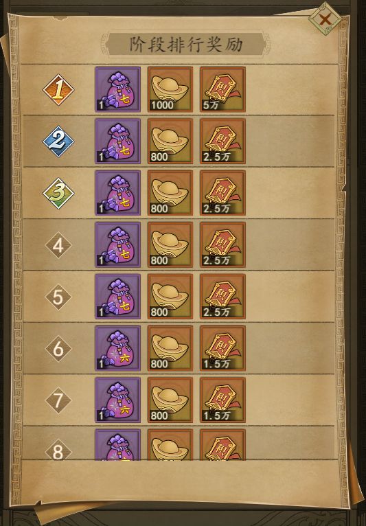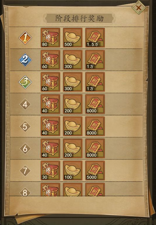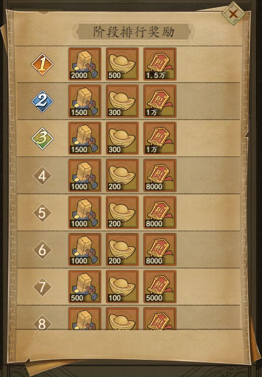 阶段排行奖励:橙色武将碎片自选箱、元宝和失鹿共逐活动积分。