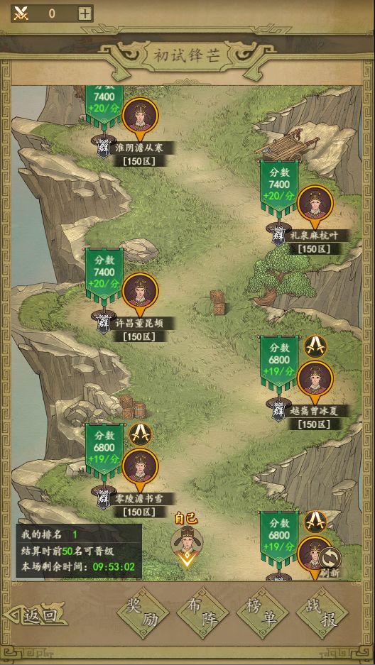 比赛规则:前2天各赛场分数排名满足条件的玩家可以晋级下一赛场。未晋级的玩家在当前赛场继续比赛。前2场比赛需要上阵2支队伍,第3场比赛需要上场3支队伍。比赛采用车轮战的形式,胜利的队伍回到队尾等待下一场战斗,直到全灭对手。21点以后无法再发起战斗,但仍可以进入赛场。24点结算当日排名,晋级名次内的玩家可以进入下一赛场。玩家只能攻打比自己分数高一档的玩家,攻打胜利后可以与对方交换位置。可攻打的玩家头顶会有剑标识,每次攻打都会消耗攻打次数,次数不足时可以花费元宝购买,购买次数越多,花费越高。