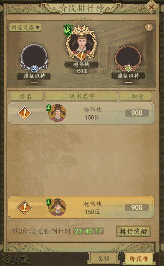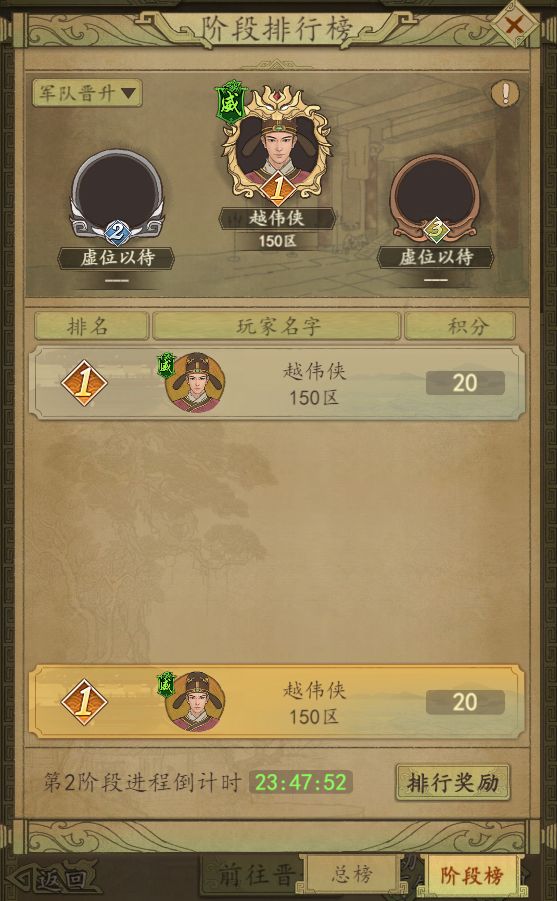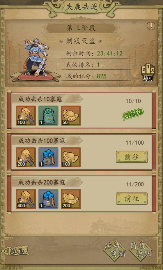 领取奖励 总排行榜规则:积分可以通过参加筹备物资,军队晋升,剿寇灭盗,比武夺魁等活动获得。每个阶段活动结束后都会根据个人积分排行发放阶段排行奖励。每个阶段的积分会累计到活动总排行,积分相同的情况下,先达到者排在前。失鹿共逐活动第九天11点会根据总排行榜排名通过邮件发放总排行奖励。