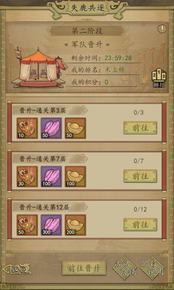 军队晋升 活动时间:军队晋升在失鹿共逐活动第四天11点开启到第五天11点结束,活动共持续1天,军队晋升为失鹿共逐第二阶段正式比拼活动。