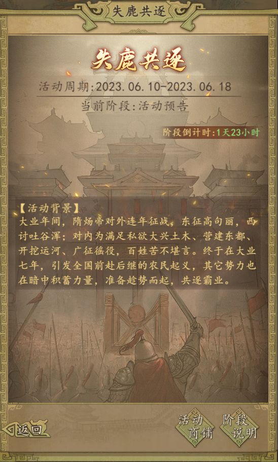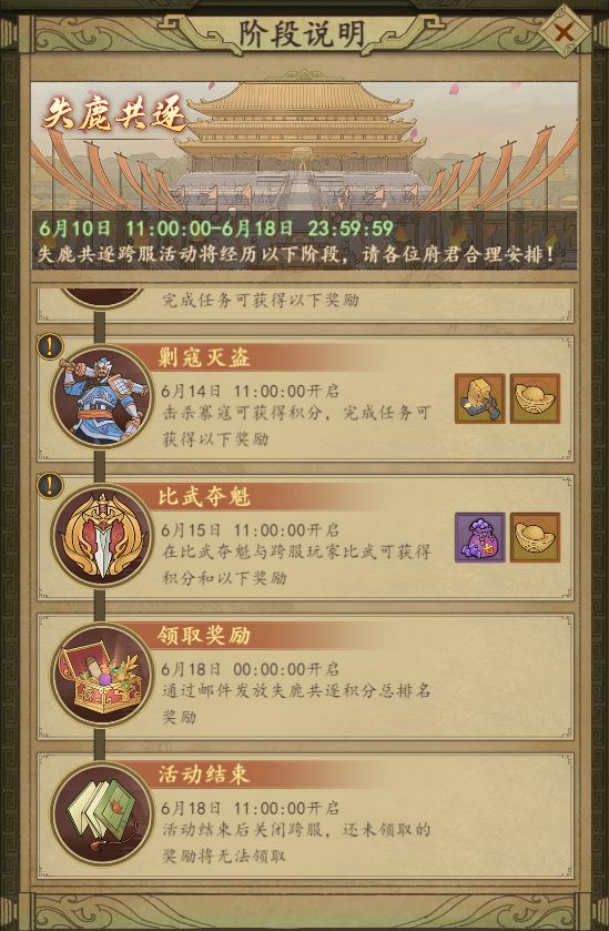 失鹿共逐为跨服活动,每次活动持续9天,活动按阶段共分为活动预告、筹备物资、军队晋升、剿寇灭盗、比武夺魁、领取奖励和活动结束7个阶段,其中筹备物资、军队晋升、剿寇灭盗、比武夺魁为失鹿共逐活动的正式比拼阶段。
