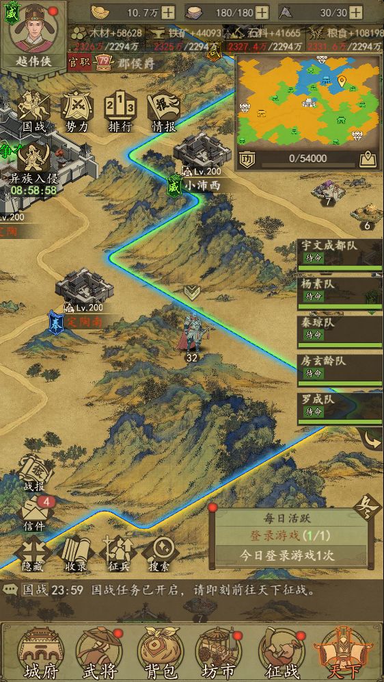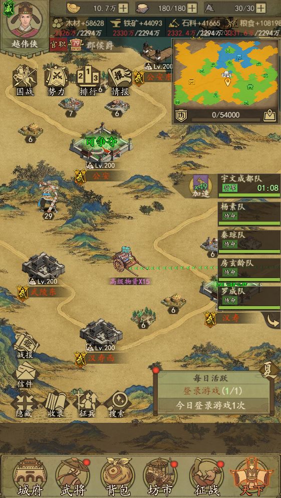 玩法说明:在活动开启期间内长安城附近会刷新一些物资点,玩家可以派军队将物资从物资点运到自己的首都。物资有三种类型,分别为初级物资,中级物资,高级物资。物资的刷新时间为活动当日的11:00至21:00和活动次日的9:00至11:00。军队要从自己的首都出发,抢夺物资后返回自己的首都。每次抢夺物资需要消耗体力,品质越高的物资消耗的体力越多。同一个物资点可以多次抢夺,但最多只可以3只队伍同时抢夺物资。