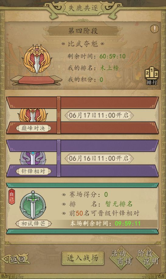 比武夺魁 活动时间:比武夺魁在失鹿共逐活动第六天11点开启到第八天24点结束,活动共持续2天13个小时,活动分为初试锋芒、针锋相对和巅峰对决3个赛场,前两个赛场各持续1天,第三个赛场持续13个小时,比武夺魁为失鹿共逐第四阶段正式比拼活动。