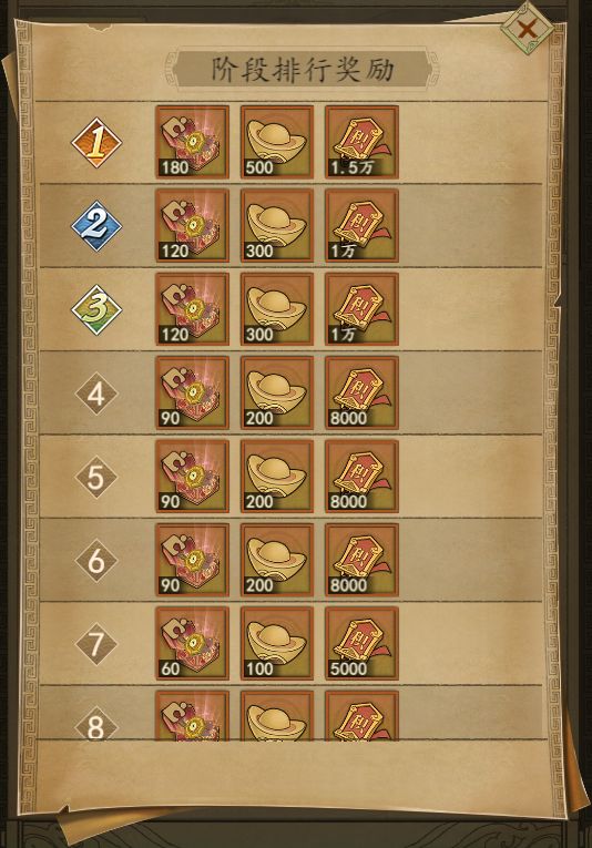 总排行奖励:部队铭牌外观、二火/三火/四火兵书任选礼包和元宝