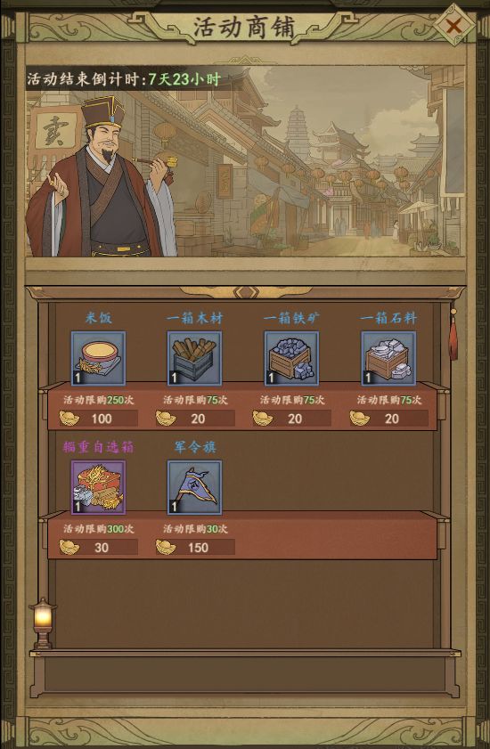 活动商铺 活动商铺在失鹿共逐活动第一天11点开启到第九天24点结束,共持续8天13个小时,活动商铺会优惠出售一批在失鹿共逐活动中所需的道具,每种道具都会有限购次数,玩家可以按需购买。