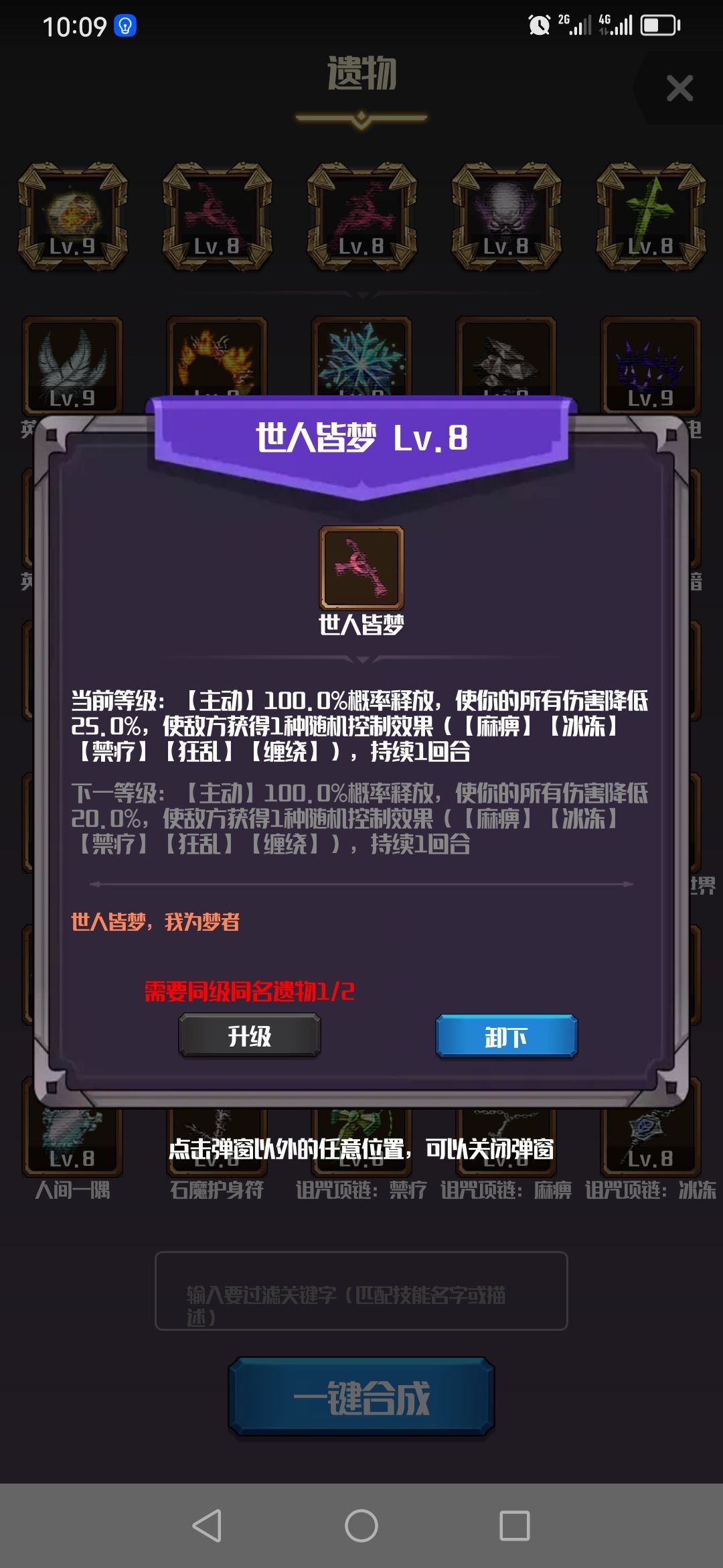 最后两个遗物的选择,一般是“世人皆梦”和“我为梦者”,前者每回合给对手附加一个控制效果,后者让对手受到的所有控制效果都会延长一回合。这个组合可以承担很多情况下的防御压力(让对手放不出技能就是好防御),但并不强制,选择它们的一大理由是它们的正面效果与等级无关,只有负面效果随升级减弱,而低层王座即使顶着它们的debuff,五法球依旧极其强力。
