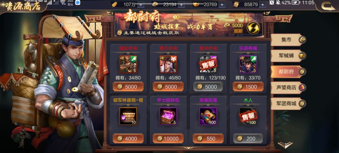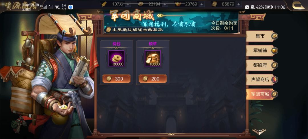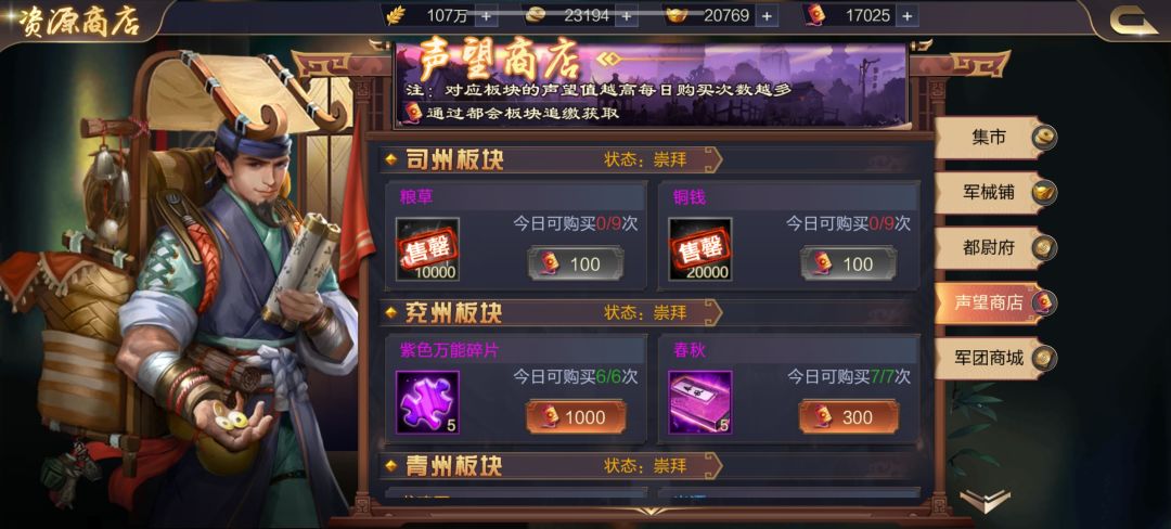 7:军团商店,军团商店有集市可以换粮食装备等等,集市每天刷得免费次数全买;有都尉府可以换将魂等等,有声望商店可以获得很多资源可以自己看就不一一介绍啦,军械铺不介意买。