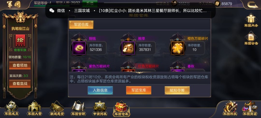 5:仓库(宝库)每天占有城池的军团宝库和仓库都会定时产出宝箱,军团成员可以用征战获得的令箭去里面抽奖。也有很多丰富资源,建议有箱子就抽,没有就留着,得快,不然一眨眼就没啦,毕竟军团那么多人上10几个宝箱。
