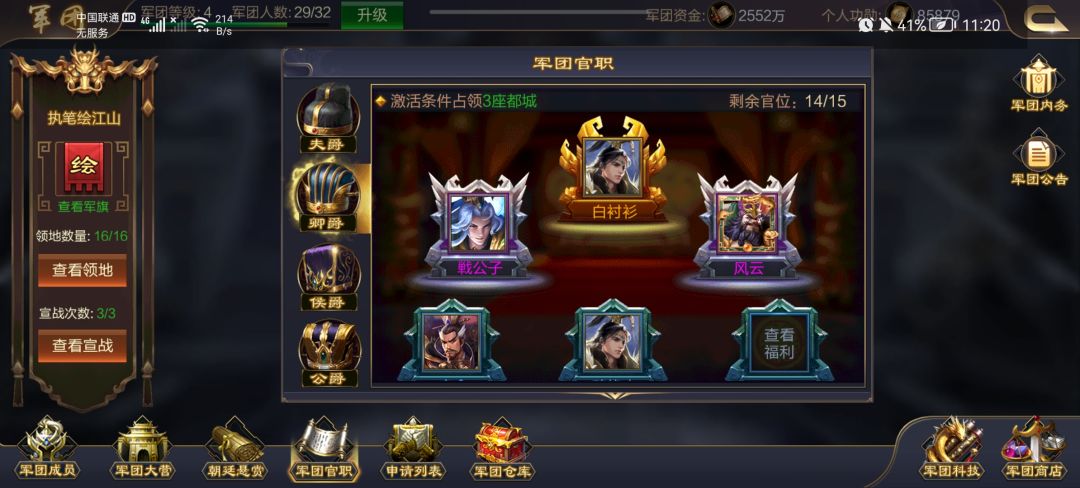 4:军团官职,军团官职是获得元宝和相应资源的一个官位,军团官职对收粮和铜币收成有一个加成。加成按军团都城数量来算。每个军团官职排法各有不同。个人建议军团官职按城站击敌排名排,这样大家刷城就会很积极,有时候一点点竞争会有很好的效果。