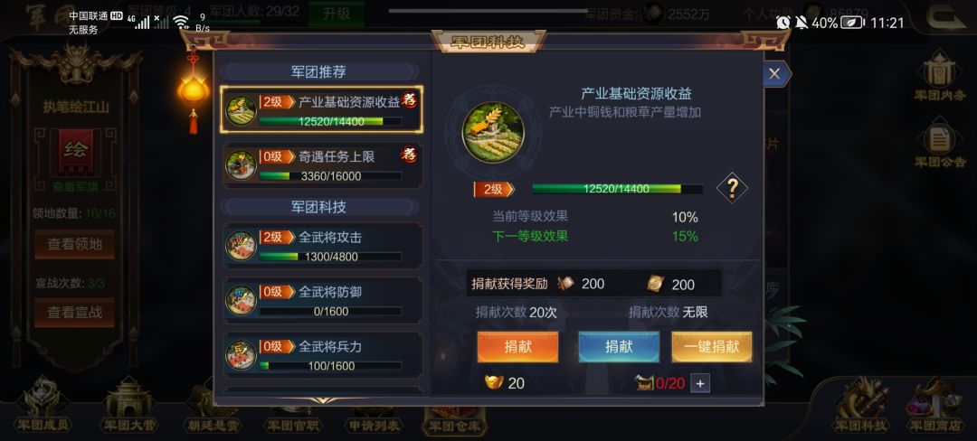 6:军团科技,军团升级会解锁相应的军团科技,军团科技有相应的加成,军团成员每天都可以通过都会追缴获得的号角进行捐赠,建议2个科技,基础产业和奇遇任务上限。基础产业升级会有粮食加成,可以多刷城,毕竟前期是真的很缺粮,奇遇任务上限增加次数,可以多得龙魂石提升真龙阁等级。真龙阁等级后期还是挺好的。
