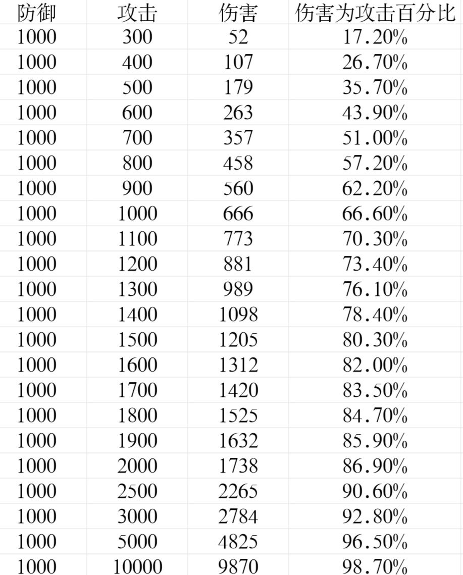 2.当防御远大于攻击时,只会造成1点伤害;当攻击远大于防御时,造成的伤害会接近100%