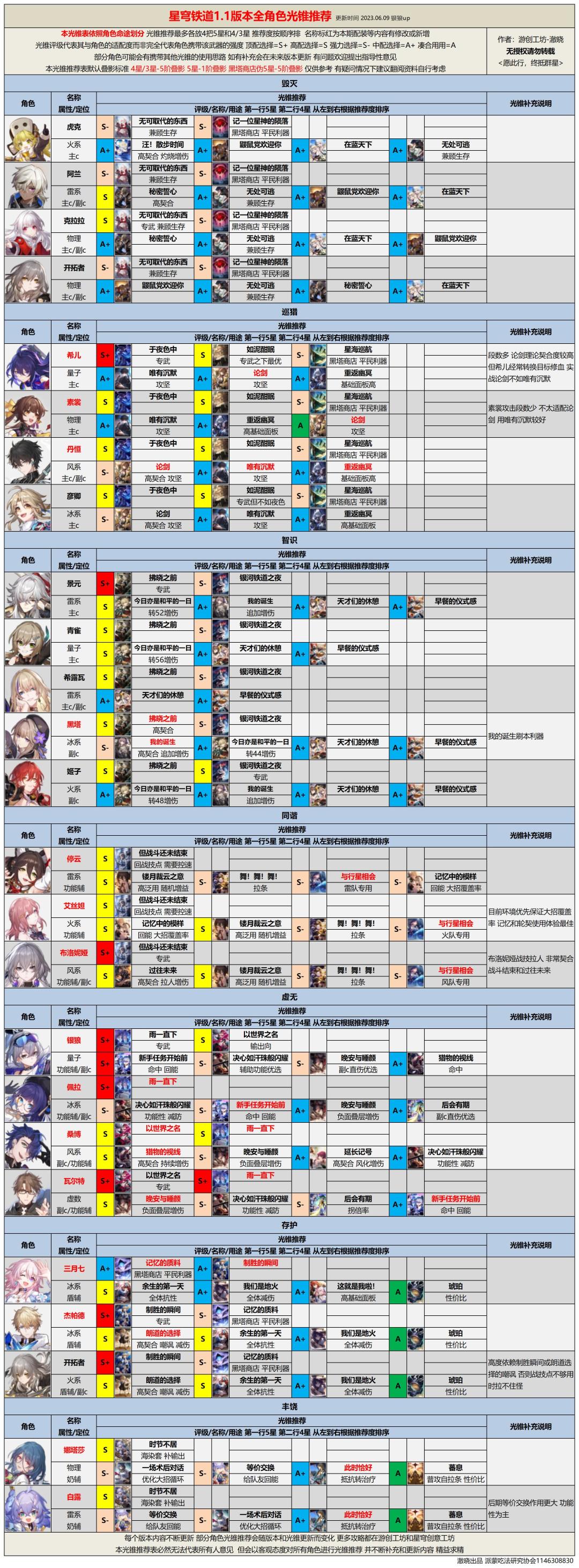 今天为大家带来1.1版本全角色光锥遗器配装推荐一图流。