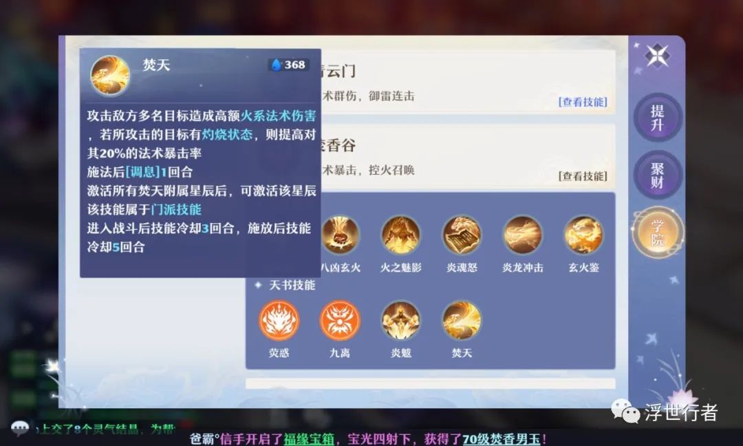焚天的效果是攻击敌方多名目标造成高额火系法术伤害,对灼烧状态的目标提高20%的法术暴击率,施法后调息1回合。