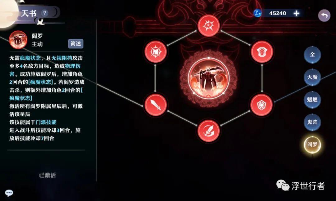 阎罗无需疯魔状态无视阻挡最多可以攻击4名敌方目标同时获得2回合疯魔状态,每击杀1个目标还可以额外为角色增加2回合疯魔状态;