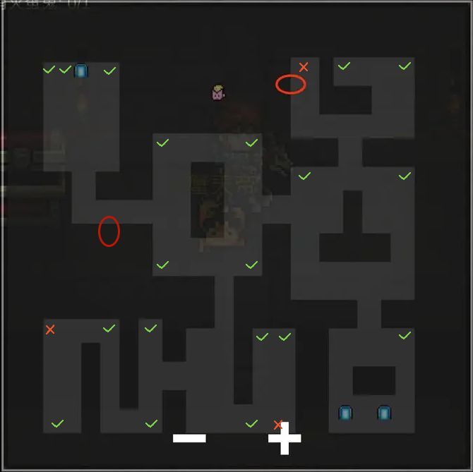 红圈是隐藏房间,绿色对号是宝箱,红色叉号是宝箱陷阱。