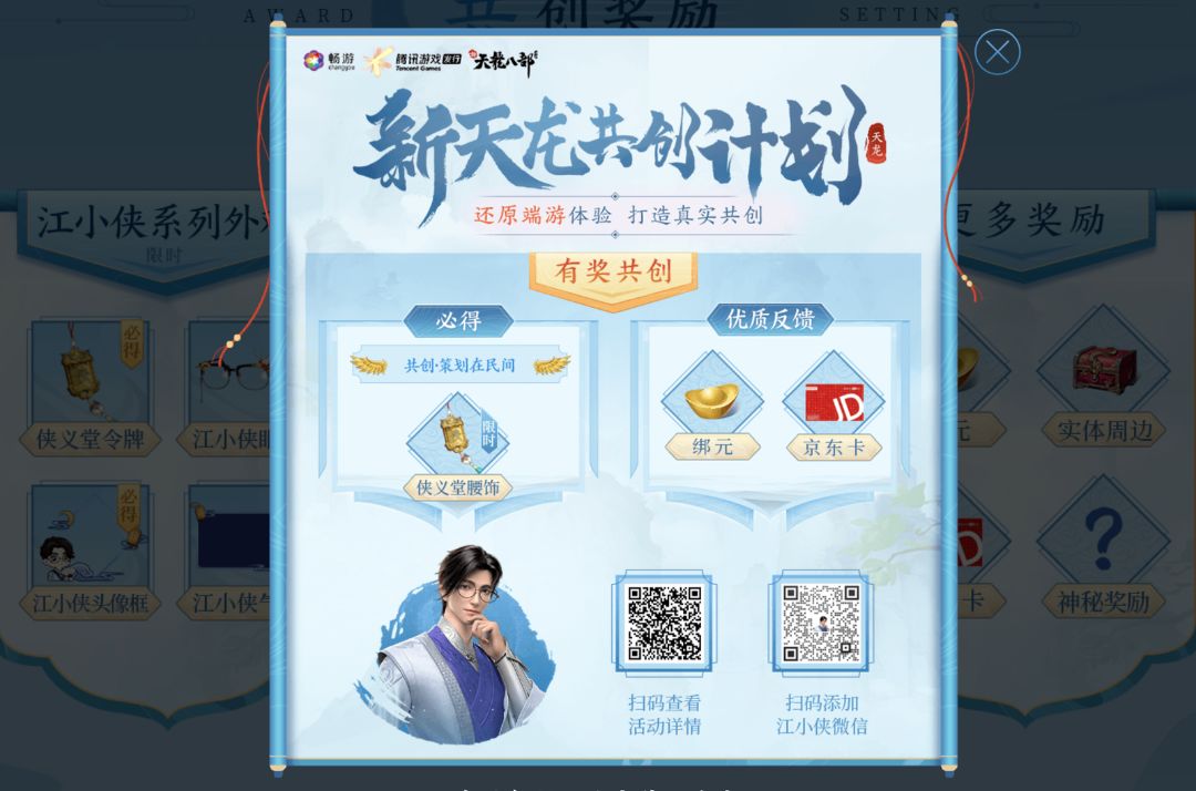新天龙共创计划持续进行中,只要少侠有想法,有好的建议都可以告诉我们!扫码添加制作人江小侠微信领取专属见面礼!参与共创的少侠还可获得专属道具礼包,优质反馈更有绑元、江小侠系列外观、更多称号、实体周边、京东卡等众多神秘奖励等少侠解锁~
