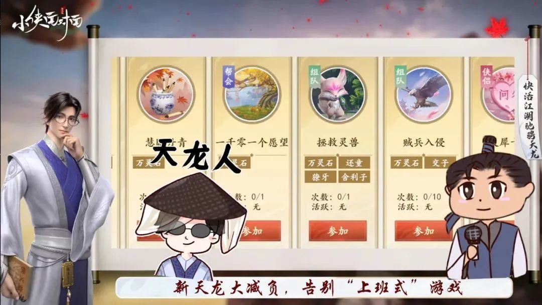 除了自由交易外,我们还收到了很多少侠关于“减负”的要求,希望在享受游戏的乐趣时不要那么“肝”!所以我们在保证收益的情况下,减少了日常任务量,让大家有时间畅游江湖,体验更多有趣的玩法,真正可以轻松行走江湖!