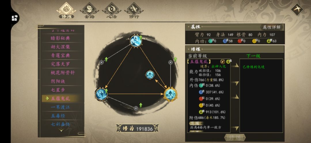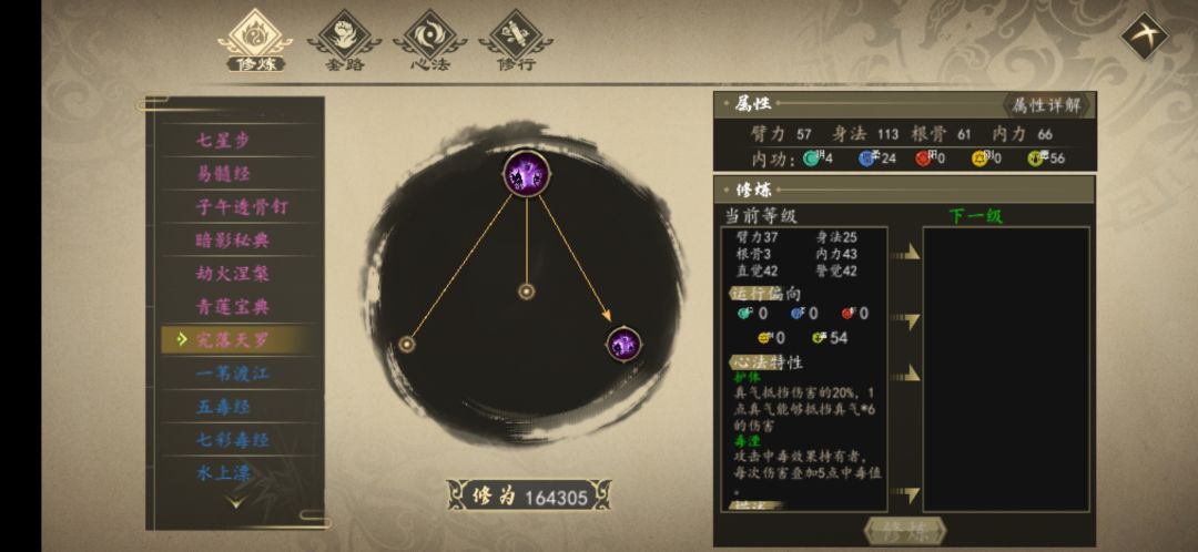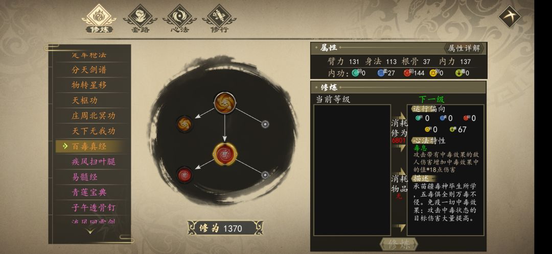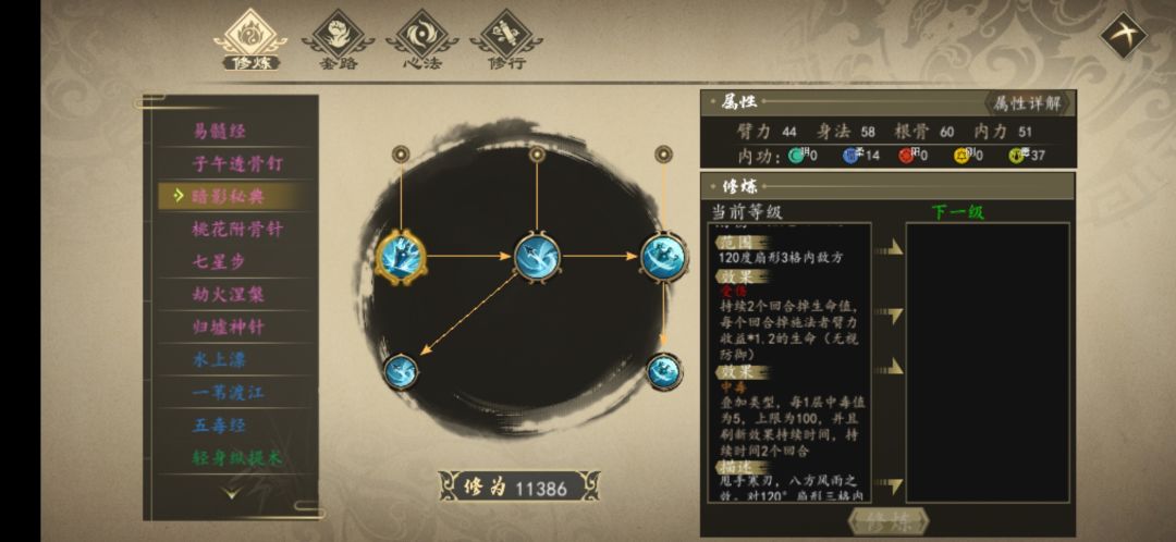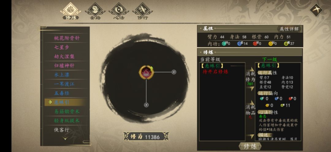 对应的阴性加成暗器功法为下面的1.2.9。中期可以去获取侠隐飞刀(金毒)。其它毒属性功法也可以用,只是加成没阴属性功法高。