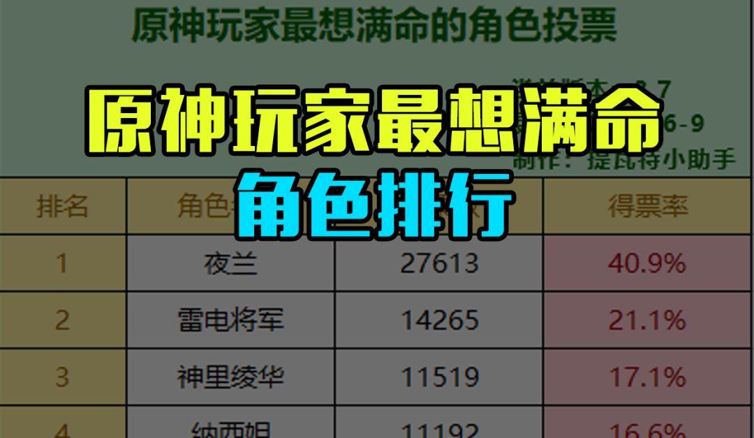 夜兰满命的效果是开大招之后的前5下普攻会变成破局矢,视为重击伤害。夜兰的满命强度,相信玩家都已经有所耳闻,夜兰可以说是公认的原神满命最强第一人。夜兰满命之后不仅自身伤害高,并且最主要的是出伤非常快,是不少竞速大佬的最爱。因此满命夜兰的强度可以说是独一档。从数据上也可以看出,夜兰以40.9%得票率一骑绝尘,是最多玩家想抽满命的角色。最后给大家附上完整的得票结果: