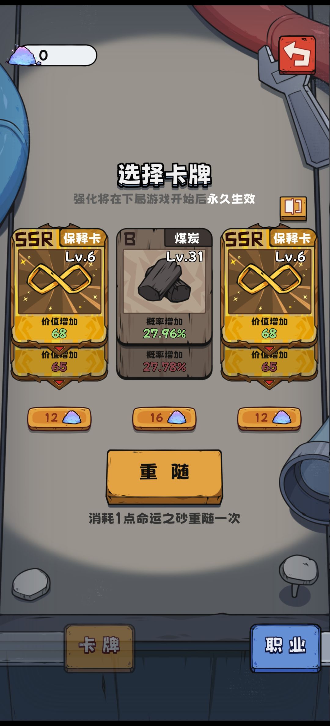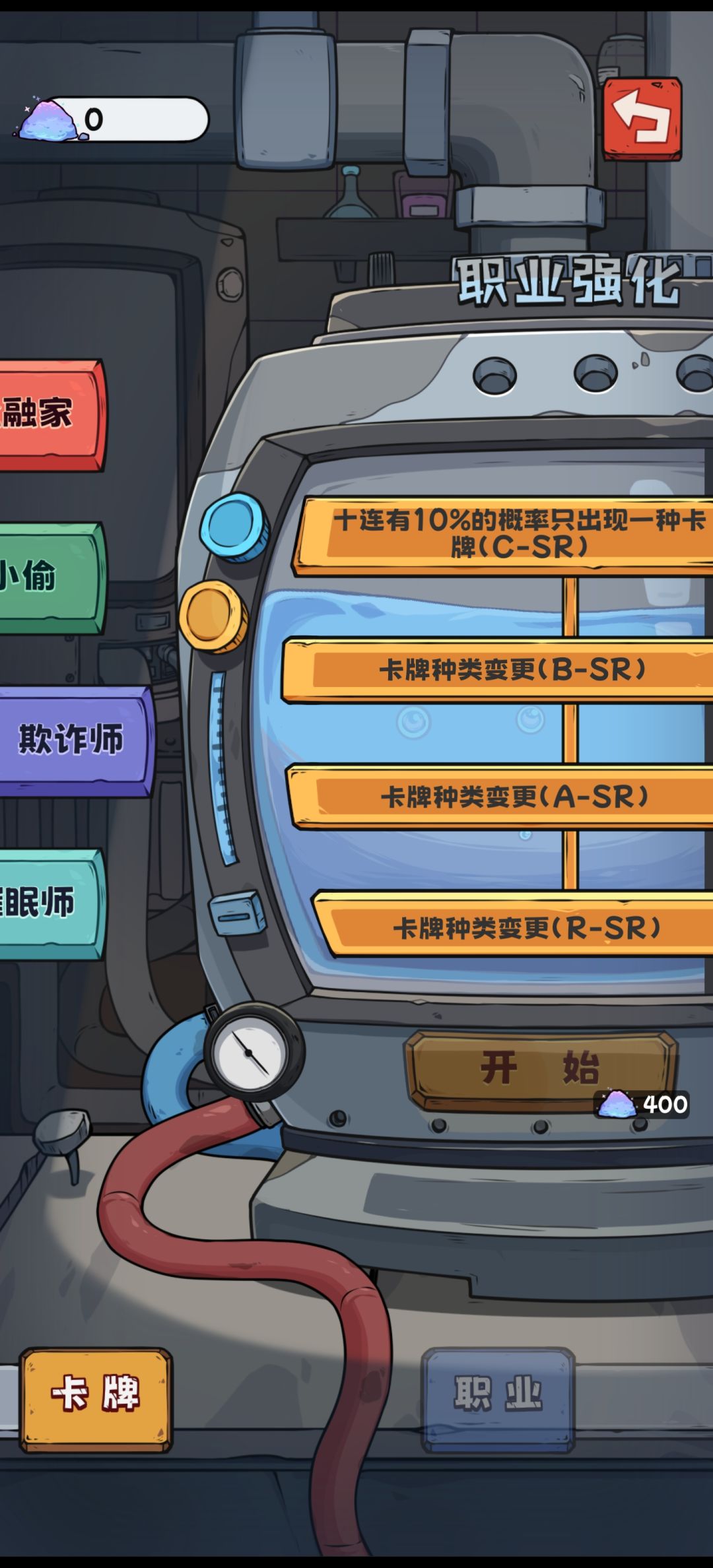 6.一样只升卡,欺诈师开局,现在卡牌强度基本拉满,够100SSR通关了,达成结局二,广告三倍150砂,升欺诈师。