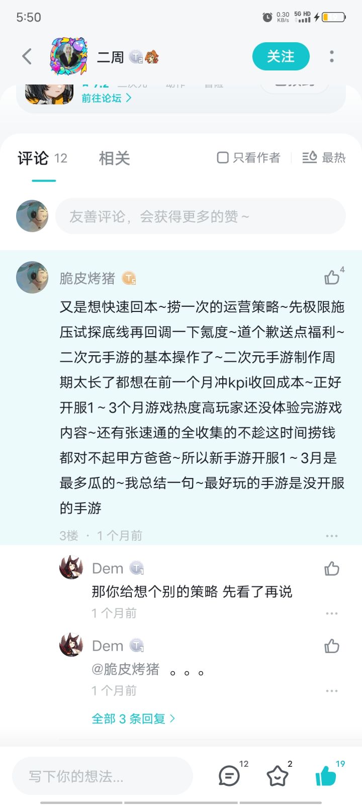 当时是1999被冲烂的时期~火环这边也有讨论1999运营策划吃相有多难看~我就回复说火环开服也一个样~毕竟投入这么多钱~果然都是老二次元手游玩家了~看你厂商竖起尾巴就知道你是想做啥~这几年瓜这么多什么操作我们没见过~我还以为火环会公测才开始噶韭菜~毕竟内测玩家也不多~用户基数还不够多~装一装让123测的人给你自来水增加点签在用户~到时公测割起来才快嘛~没想到你是一开始就把韭菜的根都挖了呀~我也是从舰r,崩2开服就开始玩2游的~这种操作是真没见过好吧~你1.2测也不能收费你把资源送到位让测试的人玩个爽再自发给你宣传不比你这样搞获得的收益高?你1.2测就是个半成品让尽可能多内测的人玩到所有内容再让他们给你反馈问题~不得不说隔壁交错核心内测福利是真的好~每天上线就是100抽~而且内测结束填完问卷还给每一个测试人员发一份周边~虽然不值几个钱但心意到位了~再看看火环只能说~战斗系统场景做的还可以美术是亮点~剧情也就一般~还有操作要求是比较硬核~大概公测也要劝退一大波人~养成系统基本市面上有的你全缝上了~看着一排的资源本简直 让人肝疼还是没倍率个全手动~抽卡混池更是绝绝子~现在还是没法充钱的一测~真的把吃相难看这4个字打脸上了~现在能看的也就美术了~但现在二游谁不是在卷美术~所以本来我的评价是5分的已经改成2分了~公测再来看看吧~如果不改你的池子降低养成难度只能祝你越办越好了