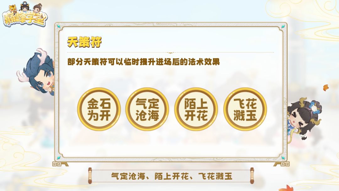 部分天策符可以临时提升进场后的法术效果。例如,可以通过金石为开、气定沧海、陌上开花、飞花溅玉、浩气凌霄、击水三千、闲庭信步、气震山河、破釜沉舟等天策符临时提升进场后的法术效果。