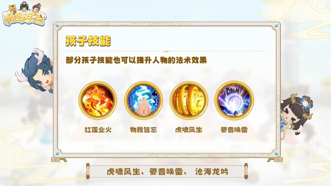 部分孩子技能可以提升人物的法术效果,如:其疾如风、半云半雾、惊弦之鸟、敲山震虎、 红莲业火、物我皆忘、虎啸风生、夔音唤雷、沧海龙吟、凤鸣九霄、风声鹤唳、岁暮天寒、 南柯一梦、七步断肠。