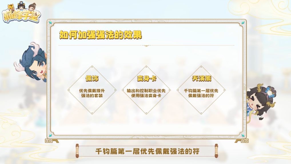 接下来,我们来看看如何加强强法的效果,主要在佩饰、变身卡和天演策三个方面加强。