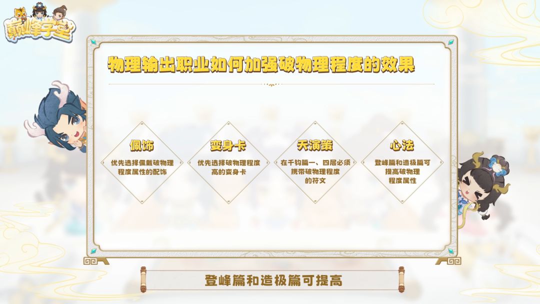 4)心法方面:登峰篇和造极篇可提高破物理程度属性