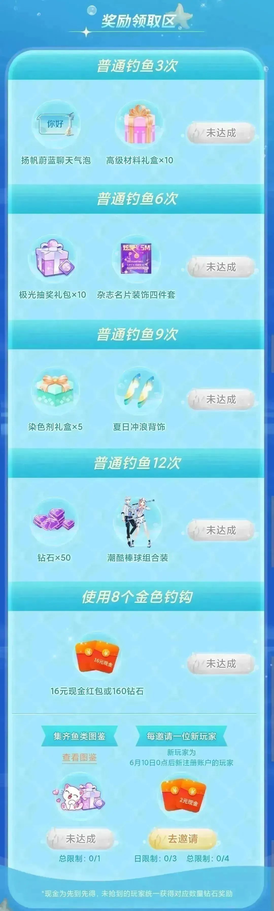 6月10日至6月23日期间,玩家可通过完成任务或邀请扬帆者助力获得普通钓钩或金色钓钩(扬帆者定义为:2023年6月10日0点后新注册账号的新玩家或2023.6.2-2023.6.9未登录游戏的玩家),使用指定次数普通钓钩/金色钓钩进行钓鱼,可领取16元现金、钻石*50、潮酷棒球组合装等好物!成功钓到鱼,还有概率得888钻石(没有钓到鱼则没有奖励,具体奖励请以页面为准哟~)!