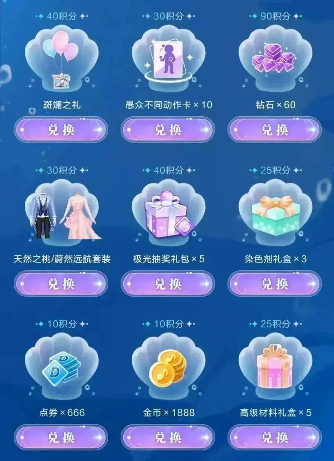 6月10日至6月18日期间,玩家通过完成页面任务可获得积分(已领取积分隔天可累计),消耗积分可兑换钻石*60、天然之桃/蔚然远航套装、极光抽奖礼包*5、斑斓之礼背饰等好物(每个道具仅限换取1次,换取的道具通过游戏内邮箱发送)。