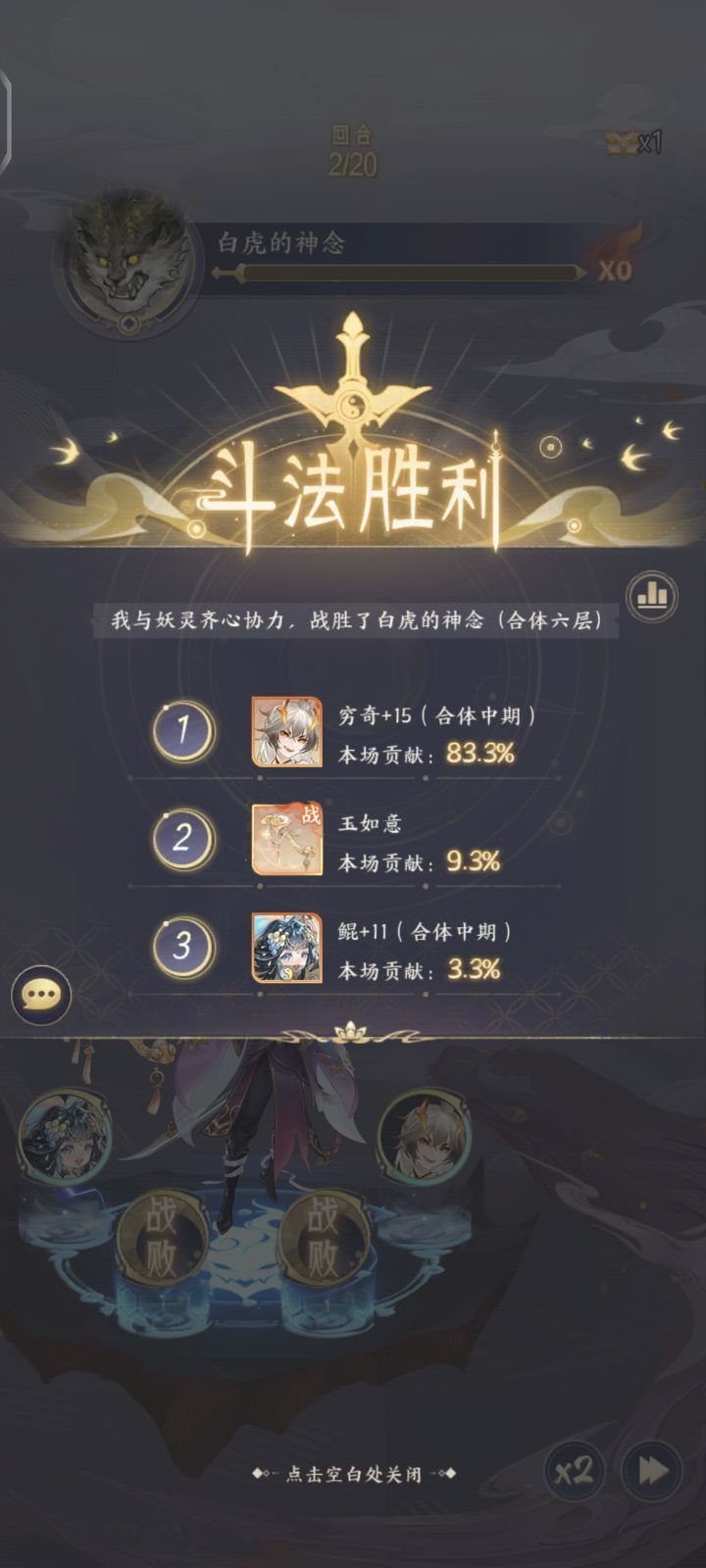1400层的主角特别变态,后面无限免伤盾套着,需要开局心法把伤害叠满配合太岁加成,主角开大加斩杀剑最好直接秒掉对面主角,不死也是空血了,狐狸补伤害就拿下,第一回合没拿下对面主角直接跳过,一直刷概率。白虎这边直接穷奇套上,0星穷奇比三星朱雀要好用,前提一定要有鲲能保住穷奇