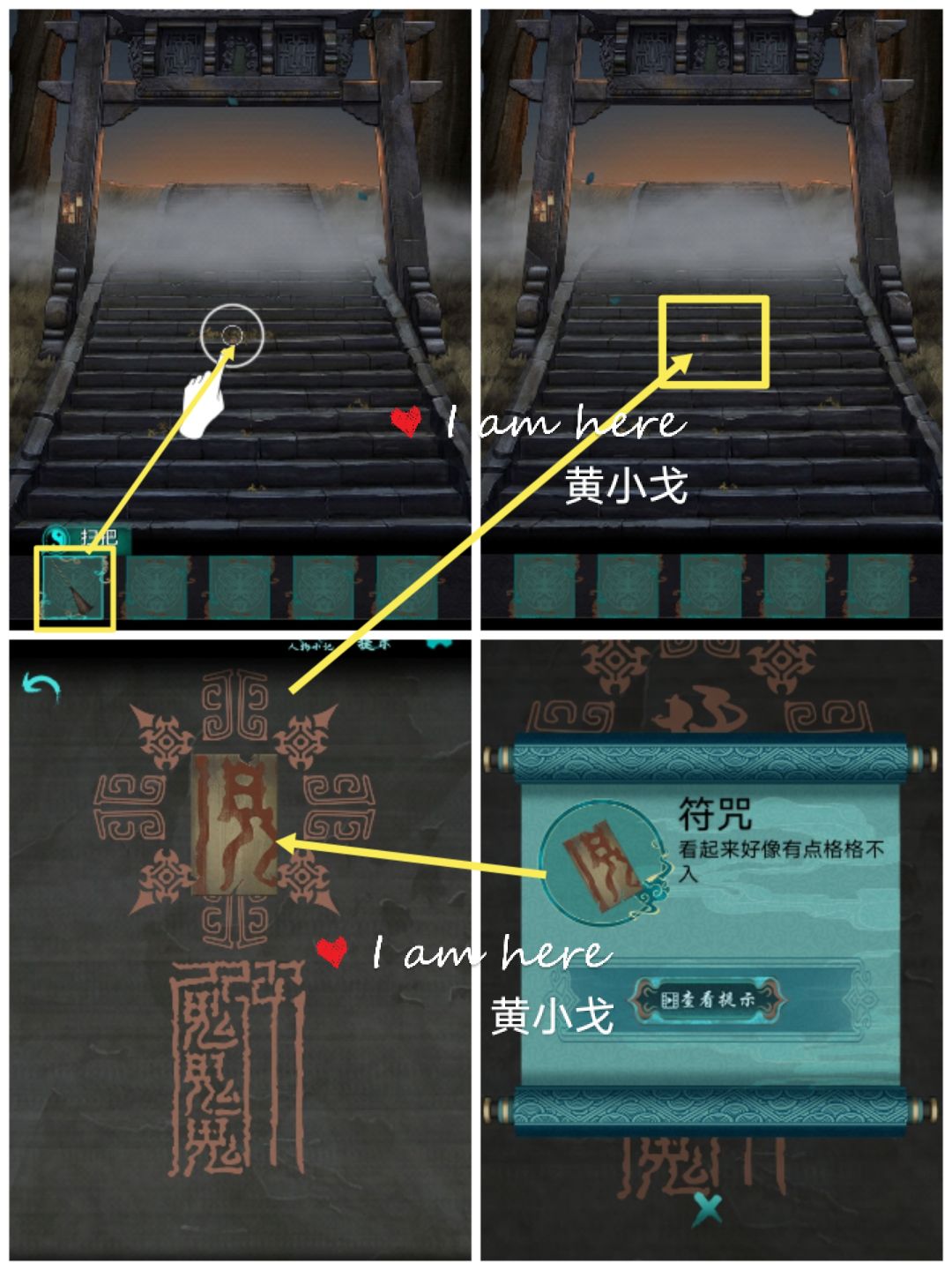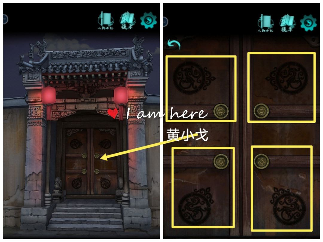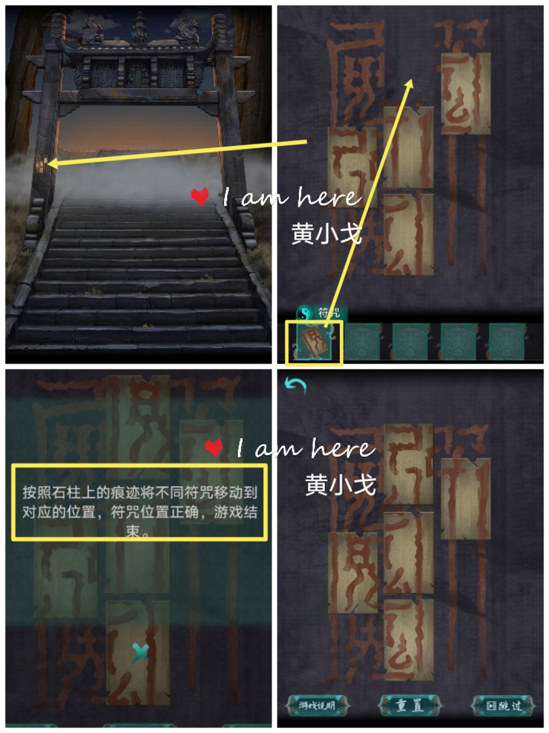 3.点击左边的石柱,贴上【符咒】,查看游戏说明,完成小游戏(把符咒放到正确的位置),触发机关