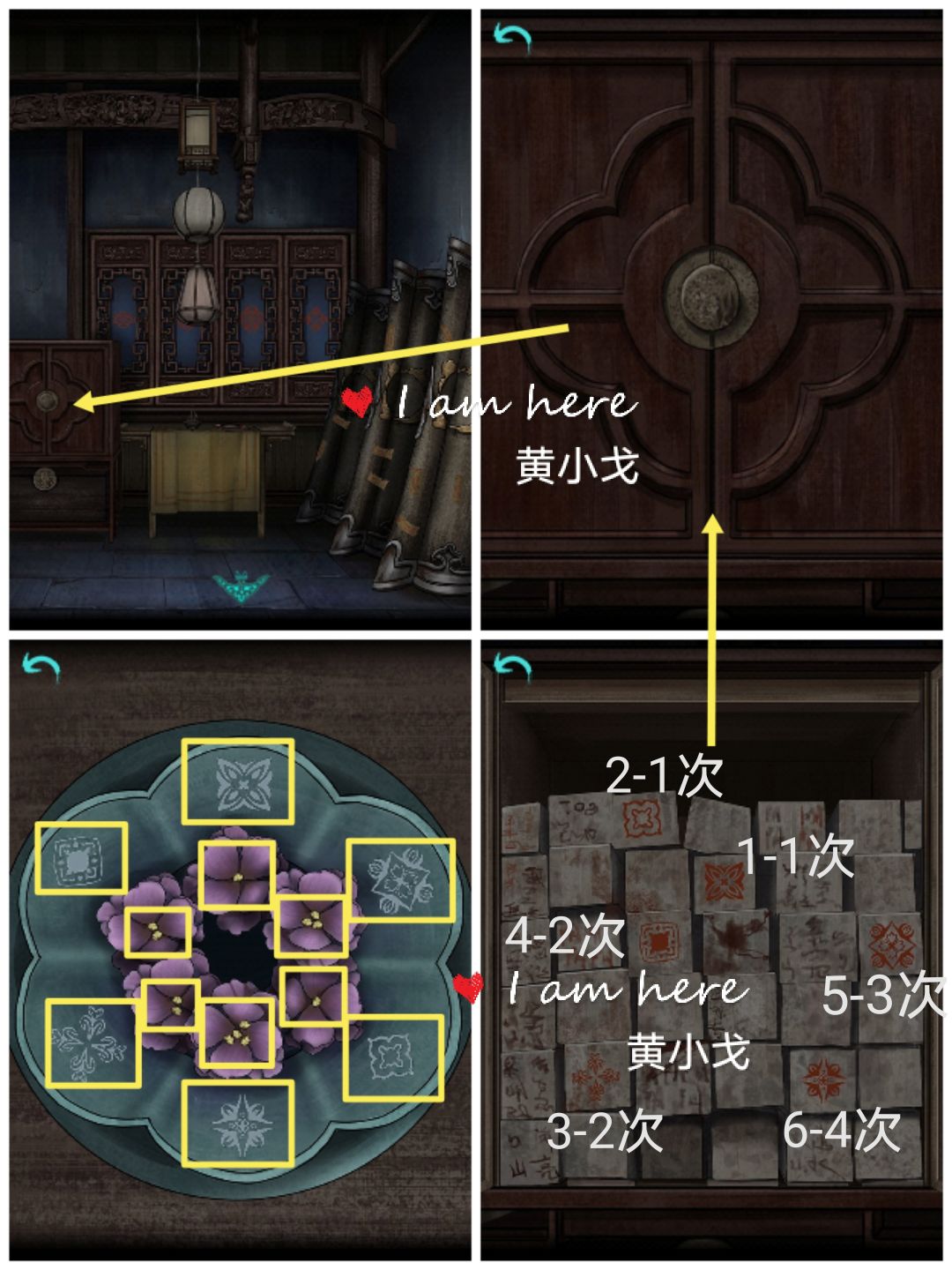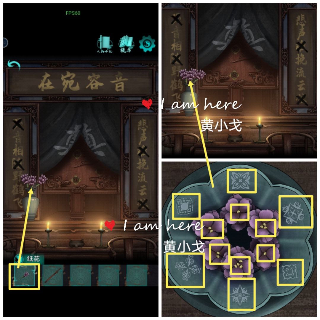 13.(义庄-棺材房)点击柜子,打开,根据花瓶上的线索,按顺序和次数点击骨灰盒(花蕊个数表示次数)
