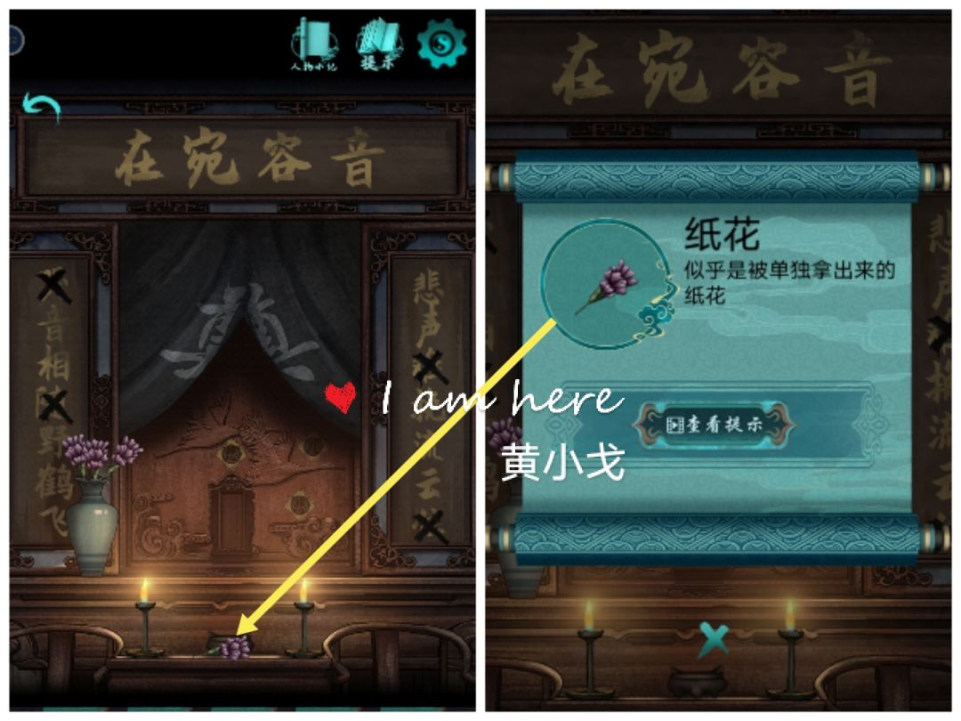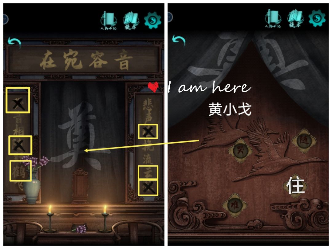 8.拉开布帘,根据机关上的图案(鹤和云)和挽联上画叉的字(鹤-哭、随,云-难、住),调整正确的字(哭、随、难、住)
