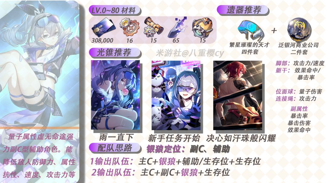 我们已知,银狼技能组基本围绕:“命中概率、伤害、终结技”,所以在遗器选择上,我们依然可以从伤害、效果命中、能量这三个方面选择。