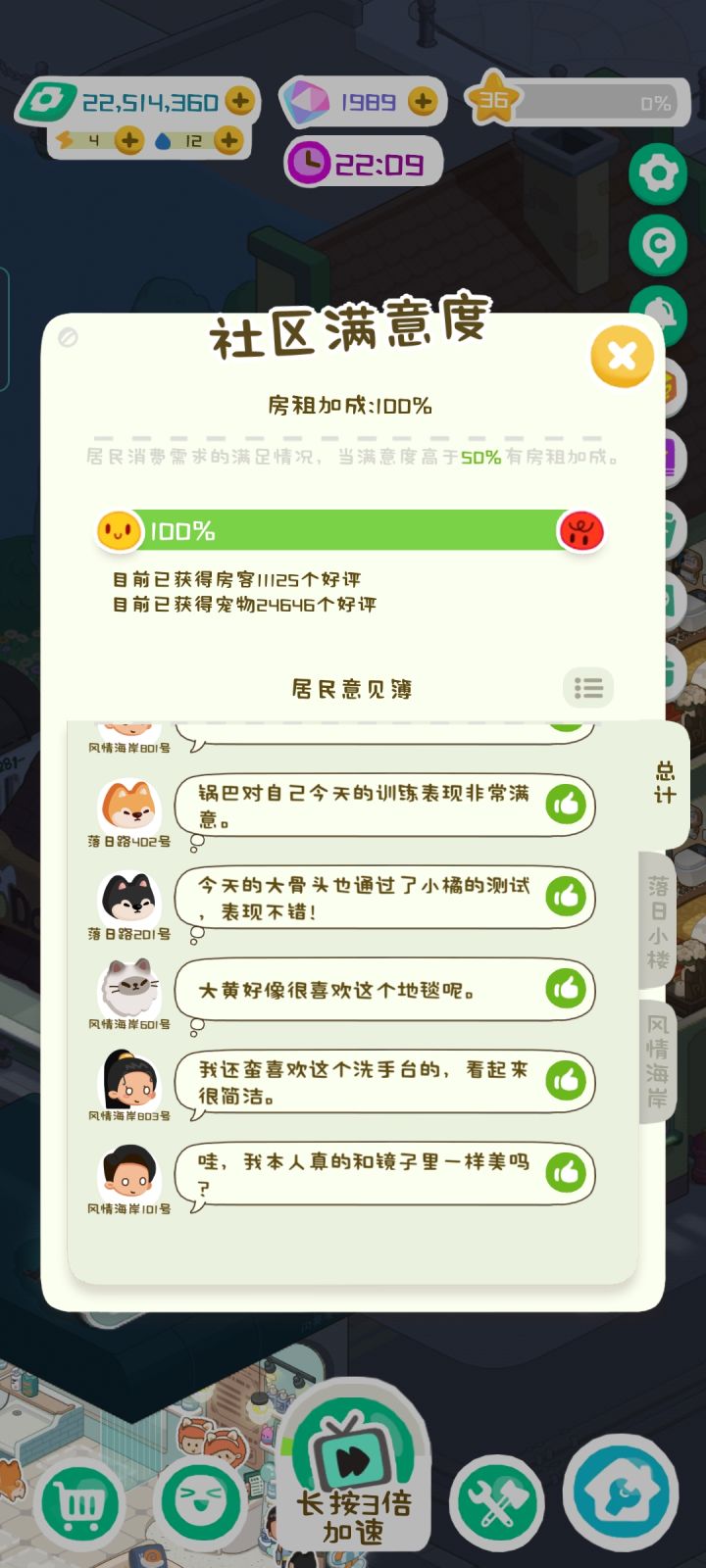 1.日暮湾宠物差评是因为需要和主人互动,主人不在家就会产生差评,只要把咖啡厅和甜品店的效率、餐位全都升满级,主人回家的时间更早就能和宠物互动就不会产生差评
