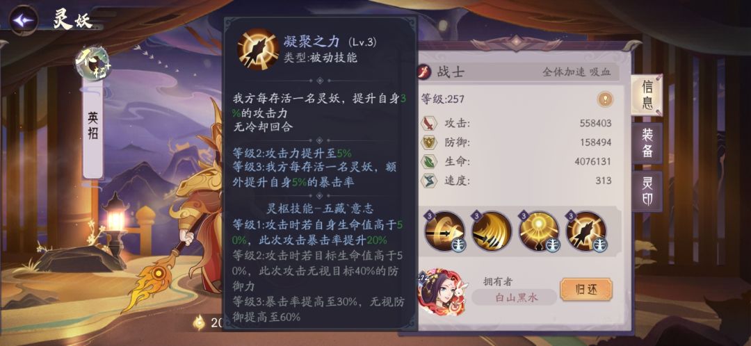 新手低练度推图必备灵妖,自带免死免控,必爆必命中,并且有高额击杀溢伤爆发伤害,自身伤害加成也是超高的