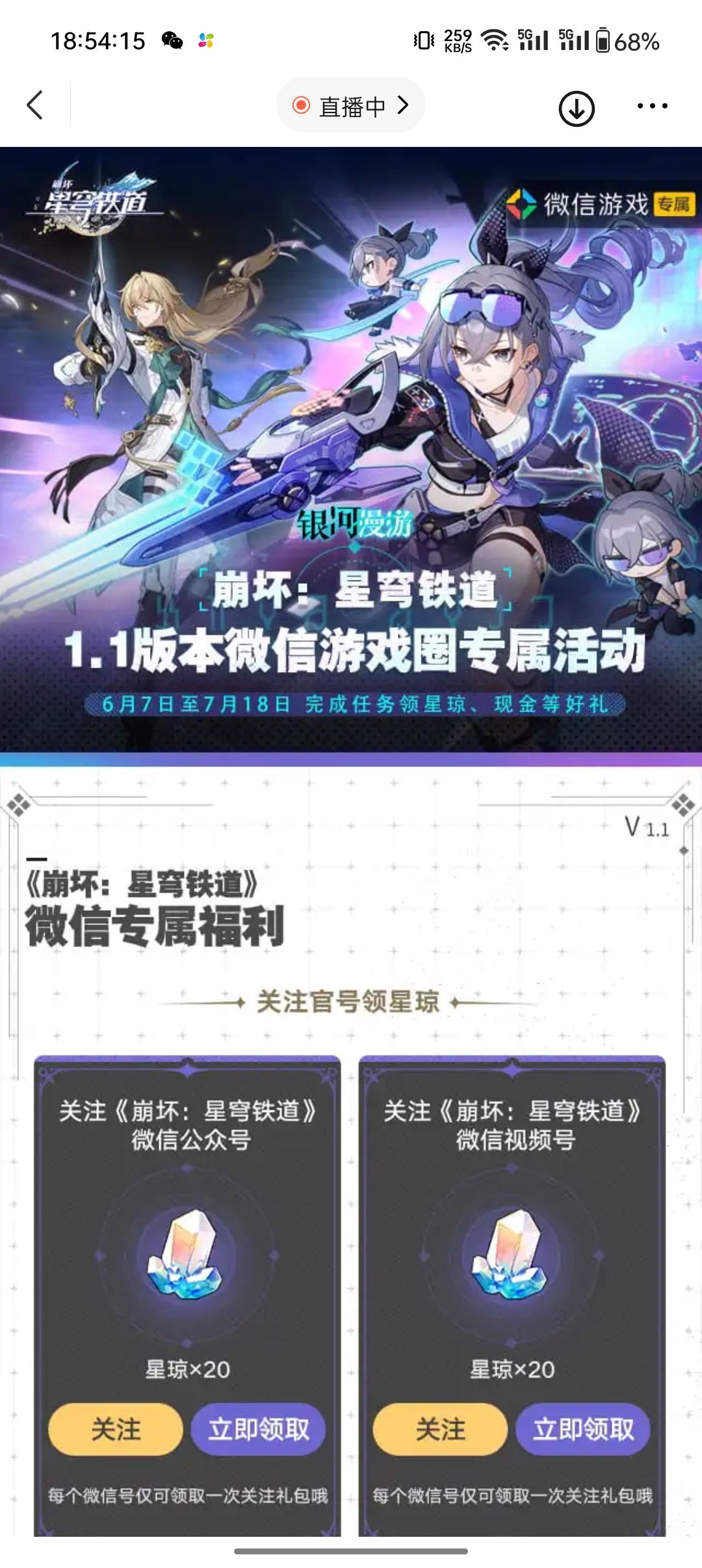 一,微信→游戏圈搜索🔍“崩坏-星穹铁道”关注视频号和公众号即可获取各20*星琼【共计40*星琼】和积分抽奖(需要绑定登录米哈游游戏账号)有机会赢取1000*星琼