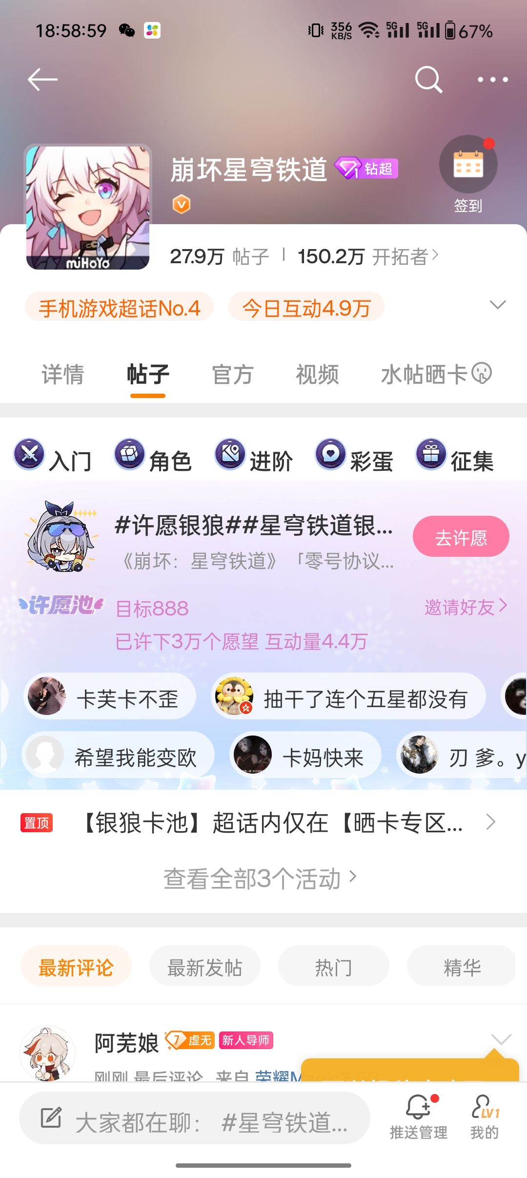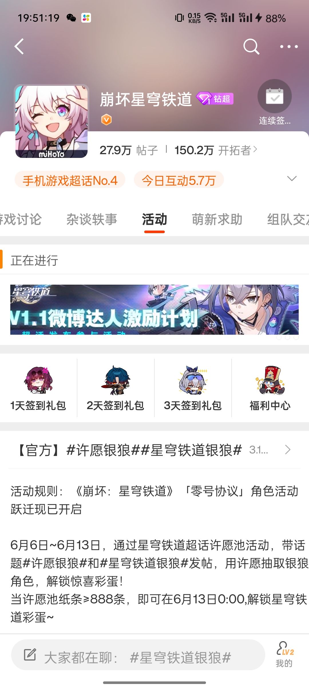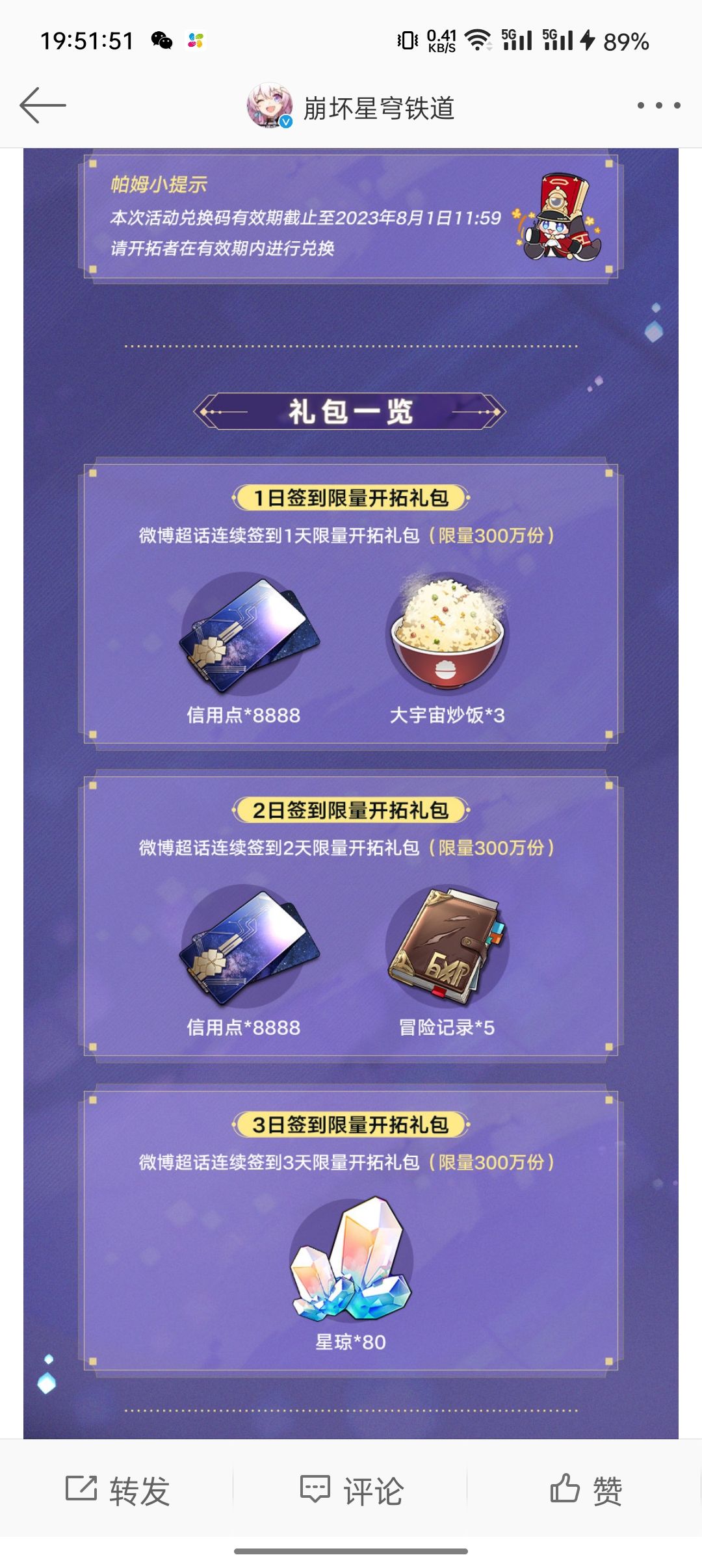 二,微博→搜索🔍“崩坏-星穹铁道”加入超话并坚持累签三天获取80*星琼