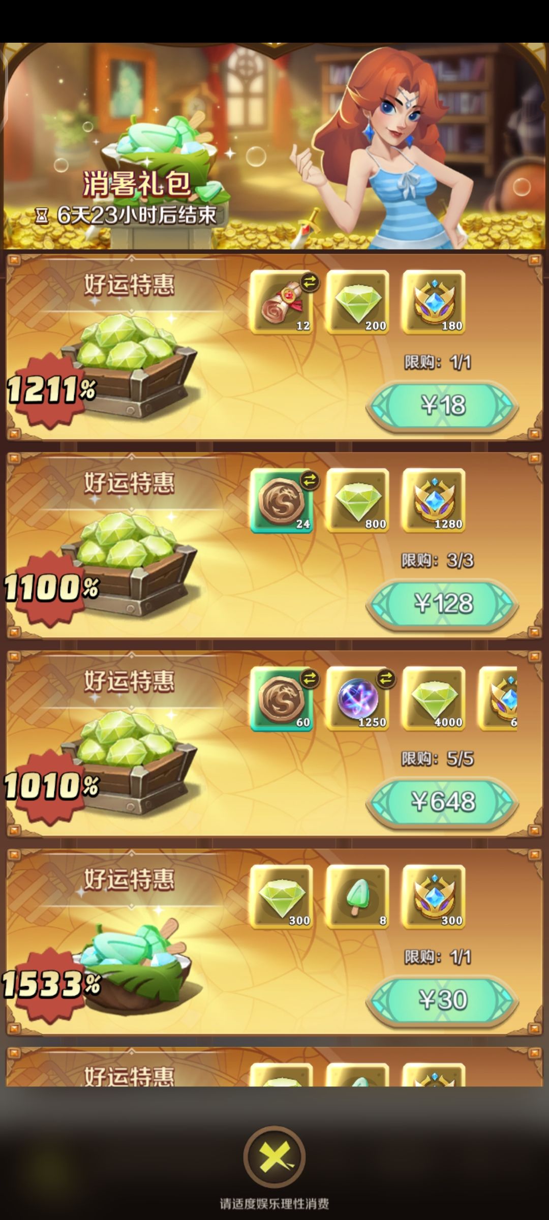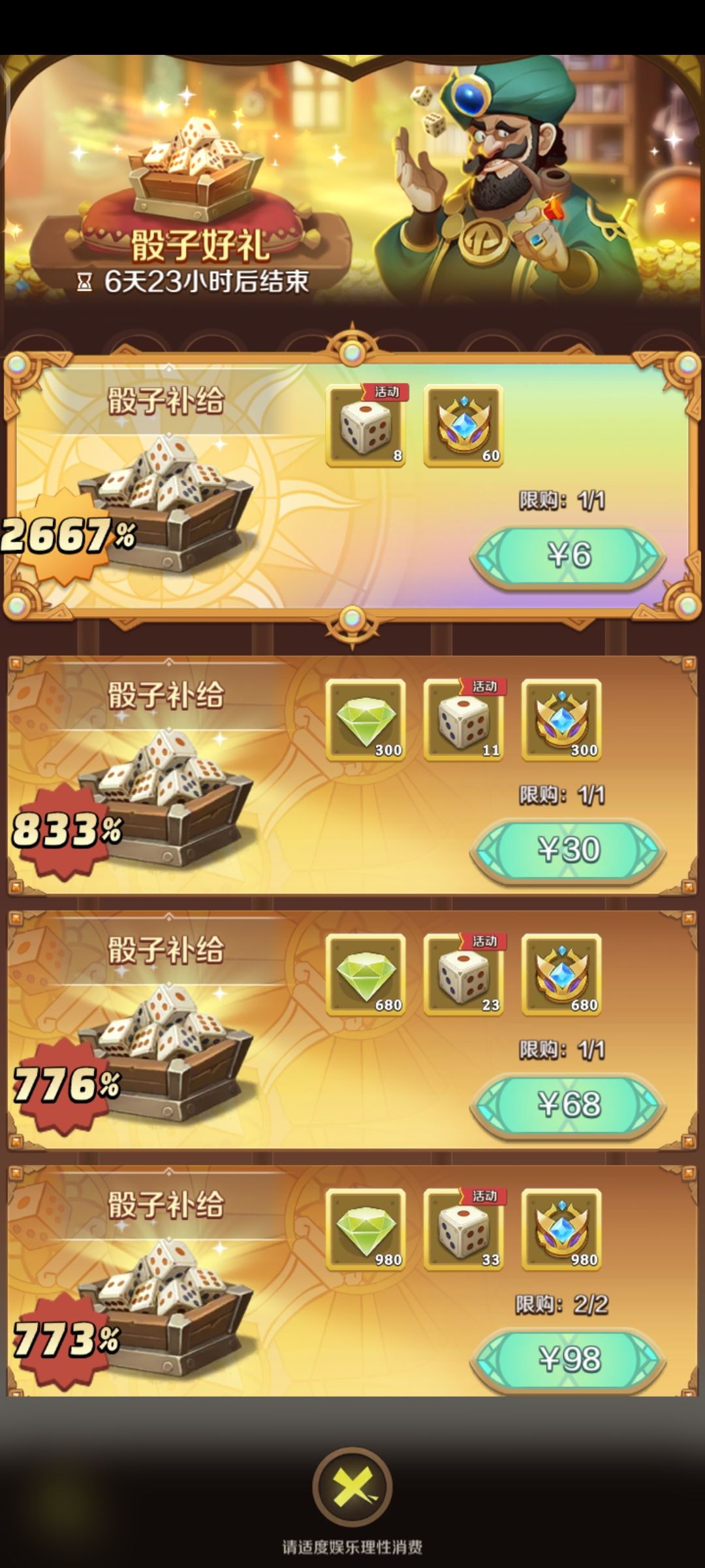 能怎样啦!!!那就氪金呗,但是氪金礼包的性价比及其低,包括六元礼包性价比同样很低(如果最后差一点就可以吃满四轮一次的大奖励的话,那可以选择购买六元礼包进行补足,否则则不推荐购买~)