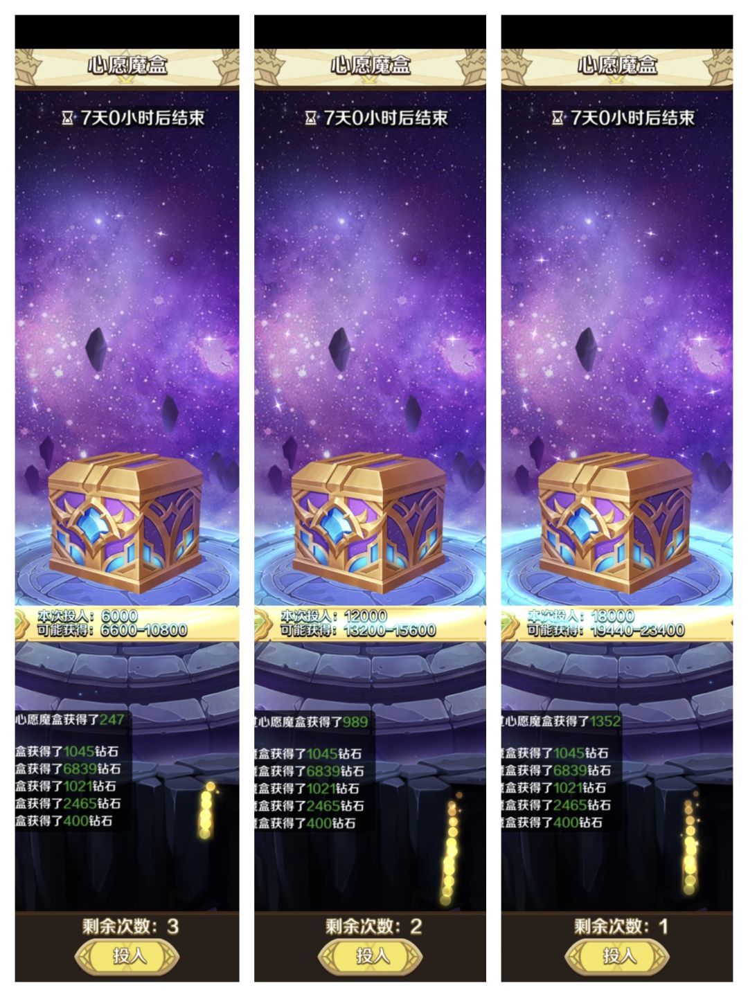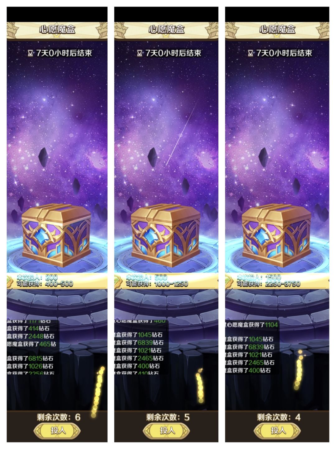 我的启动资金为1.4W钻石,但我开启最后宝箱时还剩1.95钻石,所以钻石暂时还不够的同学也不要会心~要相信自己的人品!![[TapFamily_嗯嗯]](https://img.tapimg.com/market/images/d517947da887298287261a085653cc3b.gif)