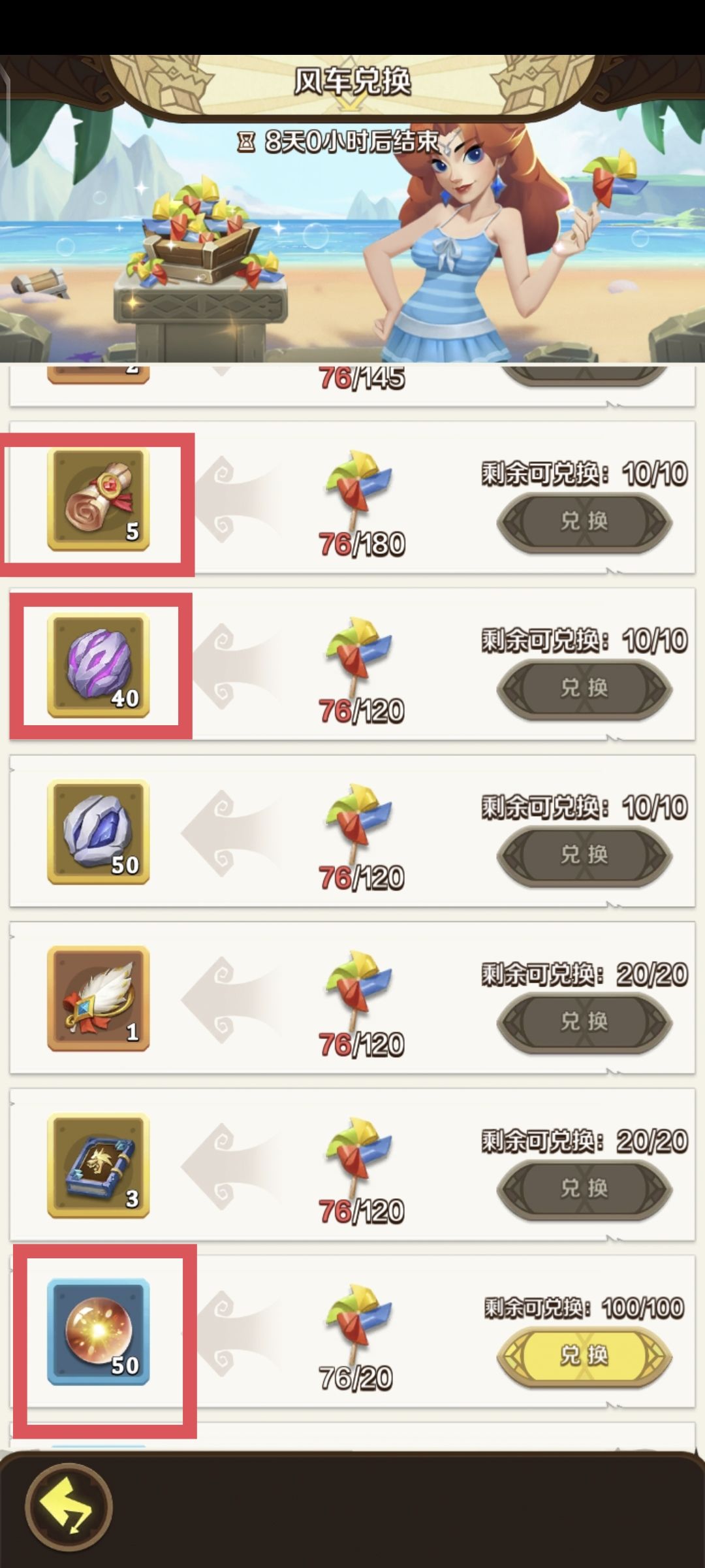 我个人的推荐是优先兑换卷轴和紫色锻造石,根据自己攒的物品量来选择,比如卷轴已经有150以上,那就可以选择兑换紫色锻造石,反之...(自行反之)