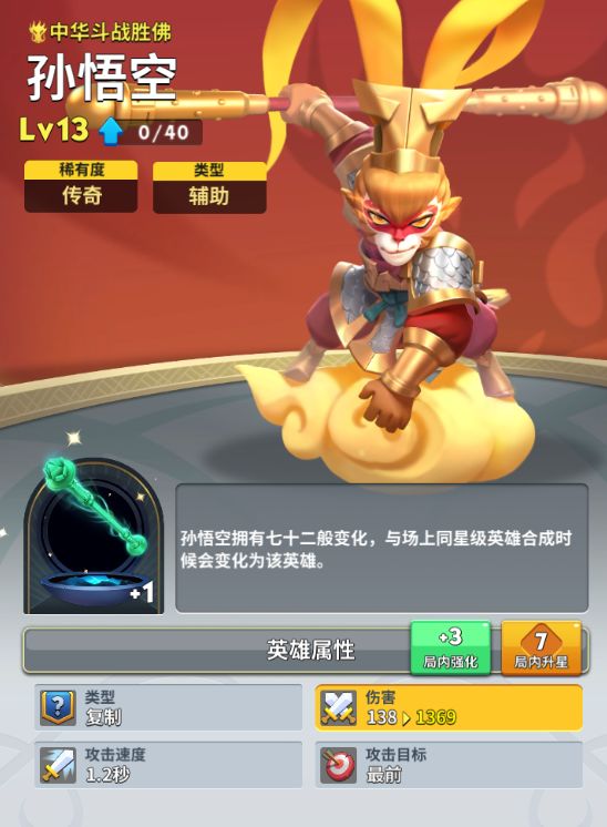 效果:孙悟空拥有七十二般变化,与场上同等级英雄合成时候会变化为该英雄。