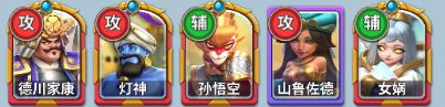 这是一套对新手非常友好的通用阵容,各种模式中都有发挥空间。灯神作为强力单体爆发输出、德川家康和山鲁佐德的补充AOE伤害,孙悟空提供快速铺场能力,女娲稳定提升主力输出卡的星级。